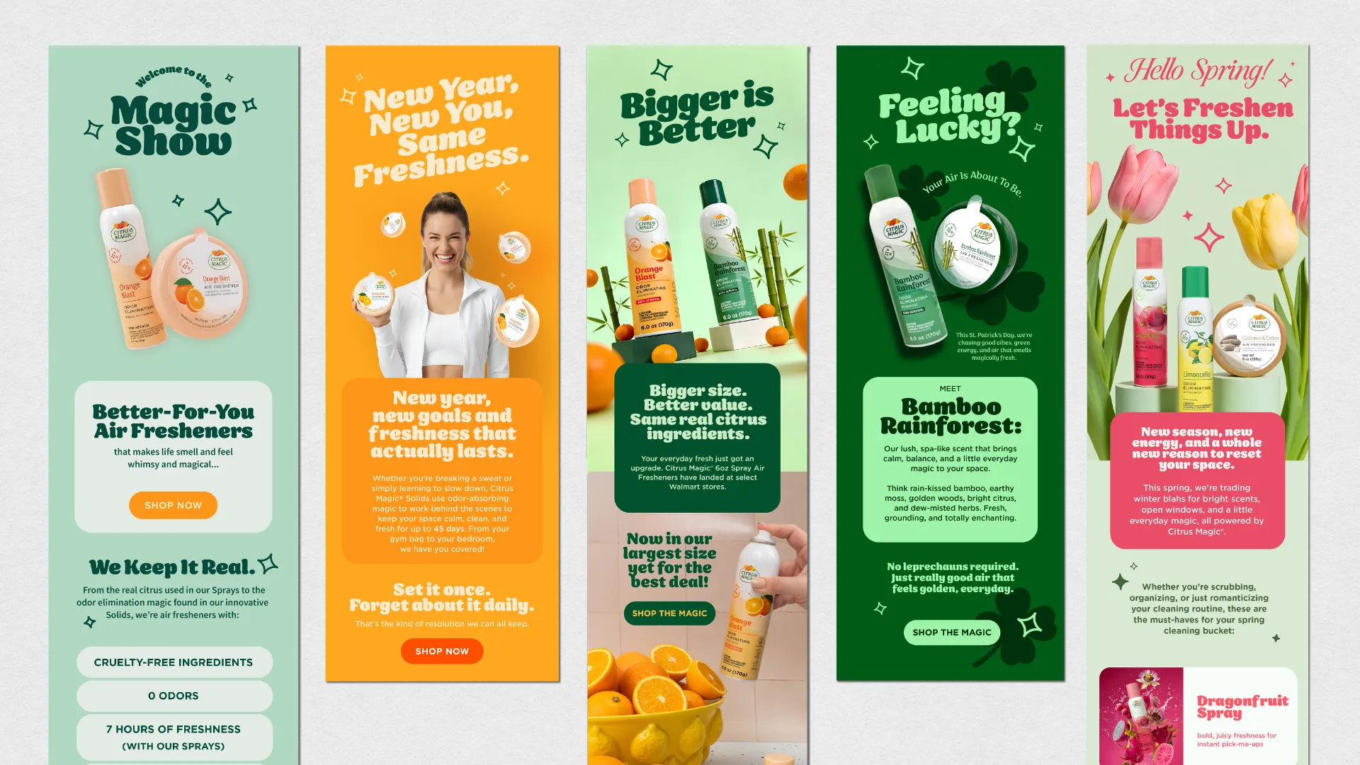 For Citrus Magic, the focus was on building a more dynamic brand experience across channels. We developed a comprehensive brand guide to anchor visual and messaging consistency, then extended that system across digital touchpoints. This included website graphics, email campaigns, banner ads, TikTok video content, and fully designed holiday retail displays. We also created PR boxes that translated the brand into a tangible, memorable experience, supporting both awareness and influencer engagement.